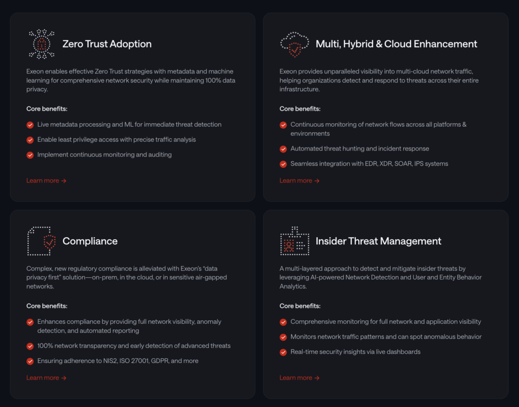 • Monitoring is non-intrusive. (Exeon analyzes meta data only, never the content, ensuring your sensitive data remains private and fully under your control)